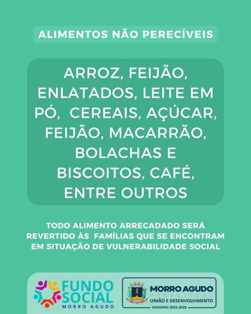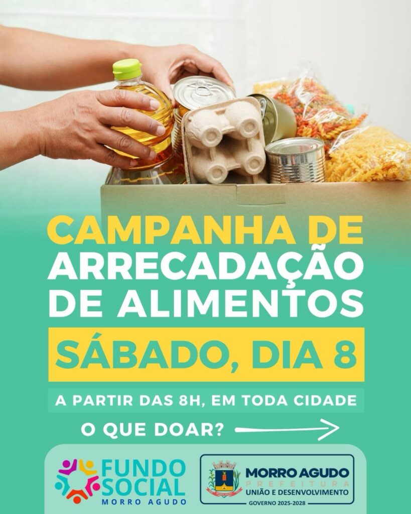 A Prefeitura Municipal de Morro Agudo, por meio do Fundo Social de Solidariedade e da Secretaria da Cidadania, está organizando uma campanha de arrecadação de alimentos não perecíveis para ajudar famílias em situação de vulnerabilidade social. A iniciativa visa mobilizar a comunidade para fortalecer a solidariedade e garantir apoio a quem mais precisa.