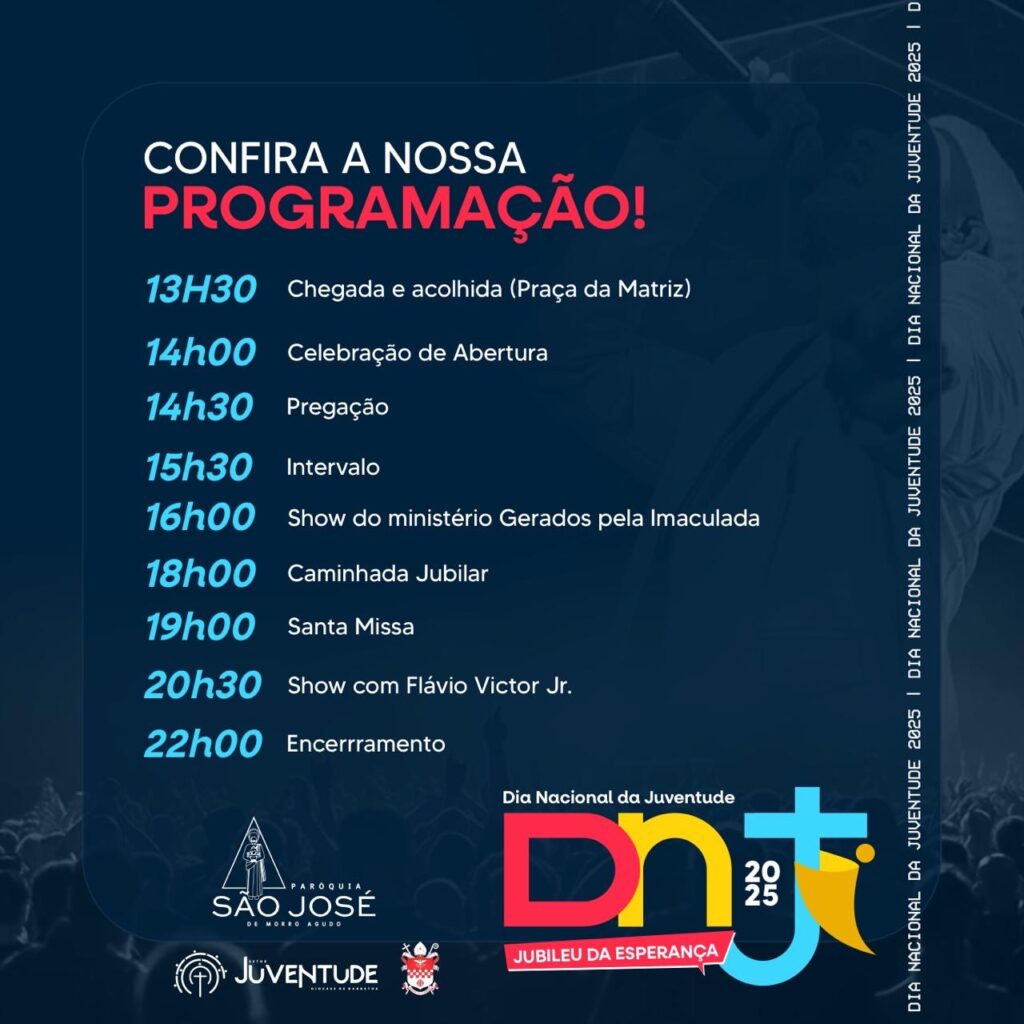 Neste sábado, 27 de setembro, a Praça da Matriz, em Morro Agudo, será palco do Dia Nacional da Juventude (DNJ 2025), um encontro que promete reunir jovens de toda a região em um grande momento de fé, esperança e alegria. A programação começa às 13h e contará com missa, louvor, pregações, apresentações artísticas, shows especiais e, acima de tudo, um encontro profundo com Jesus.