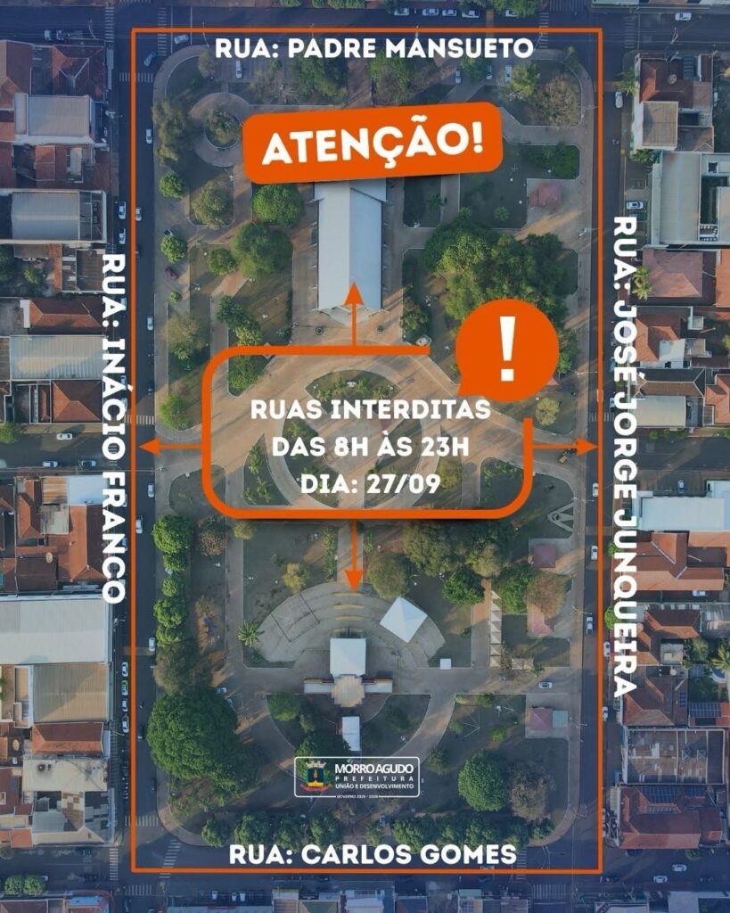 A Prefeitura de Morro Agudo, por meio do Departamento de Trânsito, informa que no sábado, das 8h às 23h, as ruas ao redor da Praça da Matriz (Inácio Franco, José Jorge Junqueira, Pe. Mansueto e Carlos Gomes) estarão interditadas para garantir a segurança dos participantes. Durante esse período, não será permitido o tráfego de veículos, motocicletas e bicicletas.