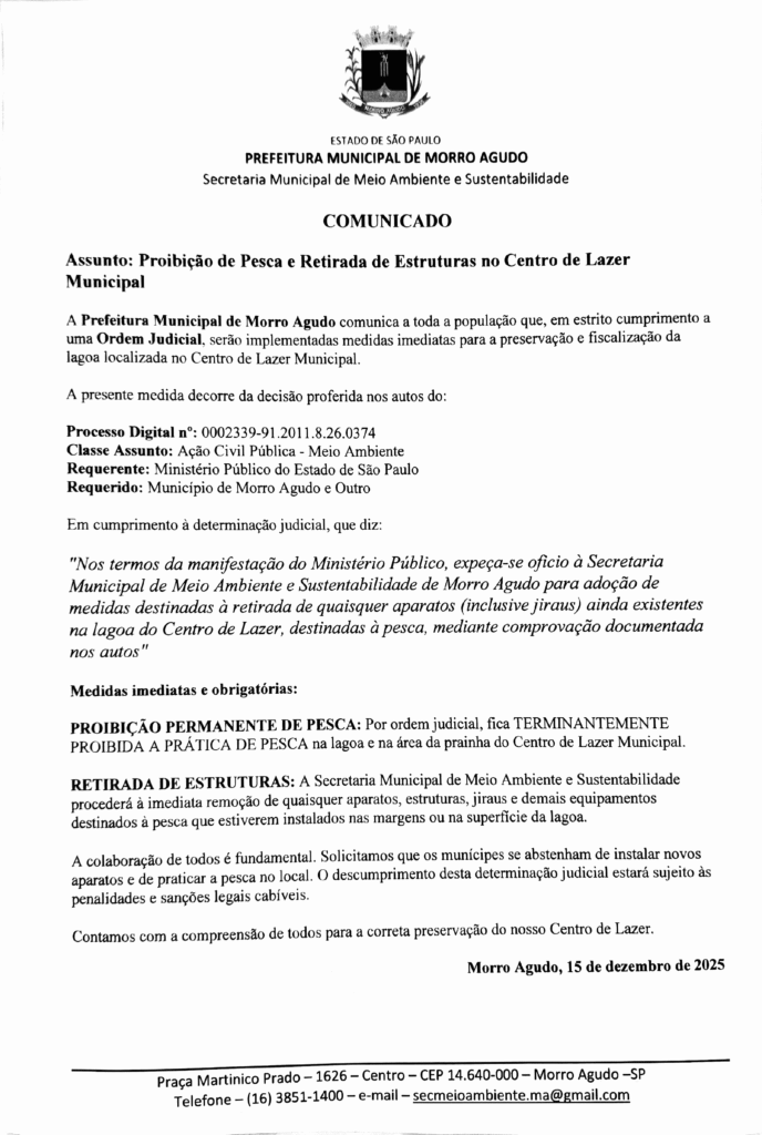 Uma determinação judicial estabeleceu a retirada de jiraus e de quaisquer outros aparatos destinados à pesca ainda existentes na lagoa do Centro de Lazer, em Morro Agudo. A medida decorre de manifestação do Ministério Público do Estado de São Paulo no âmbito de uma Ação Civil Pública que tramita desde 2011. A determinação reforça que a pesca no local é proibida por ordem judicial.