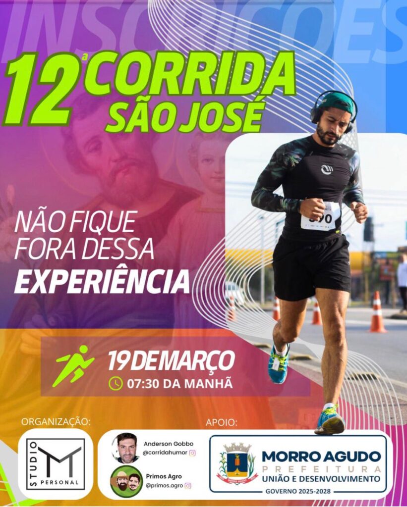 Morro Agudo volta a respirar esporte nesta quinta-feira (19) com a realização da 12ª Corrida de São José. O evento, tradicional no município, acontece a partir das 7h30, com largada no Centro de Lazer Municipal, reunindo atletas e público em mais uma edição.